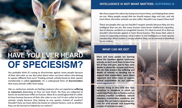 Ética Animal distribuye folletos y hojas informativas en diferentes países para aumentar la concienciación sobre el especismo. Puedes descargar nuestros materiales en estos enlaces: