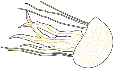 Tentáculos (aproximadamente 300 milhões de neurônios em polvos). Parecem reter uma quantidade significativa de funções sem conexão com o cérebro central.