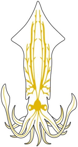 Tentáculos (aproximadamente 300 milhões de neurônios em polvos). Parecem reter uma quantidade significativa de funções sem conexão com o cérebro central.